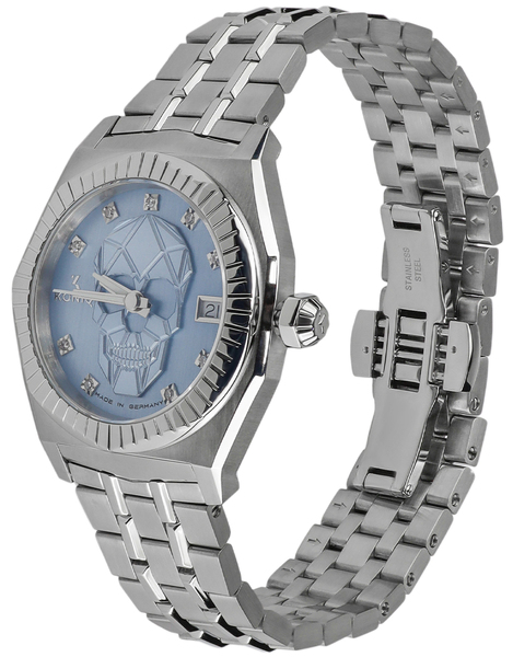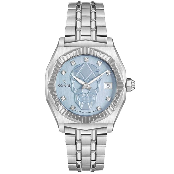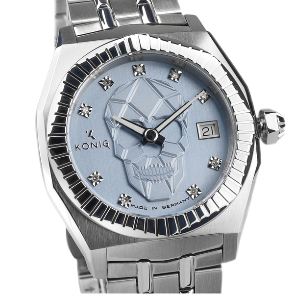 Jako pierwsza rzuca się w oczy czaszka o strukturze przypominającej kryształ, zdobiąca środek niebieskiej tarczy zegarka. Jako indeksów użyto 9 certyfikowanych diamentów, wskazywanych przez białe, proste wskazówki. Na godzinie 3 znalazł się datownik wskazujący bieżący dzień tygodnia, po przeciwnej zaś stronie logo oraz nazwę marki Koenig. Całość tarczy chroni i przykrywa szkło szafirowe o wysokiej odporności na zarysowania.