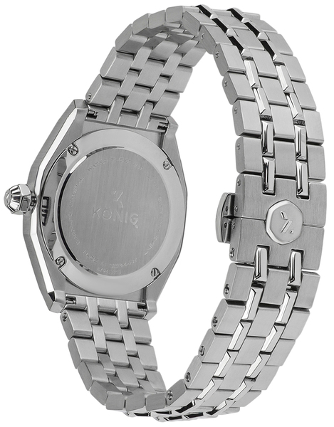 Kopertę czasomierza odlano ze stali szlachetnej, odpornej na uszkodzenia mechaniczne oraz efekty korozji. Tarczę okala zdobiony, srebrny bezel, zachowujący charakterystyczny dla wytworów marki Koenig ostry, ośmiokątny kształt. Całokształt zaprezentowano na szykownej, stalowej bransolecie.