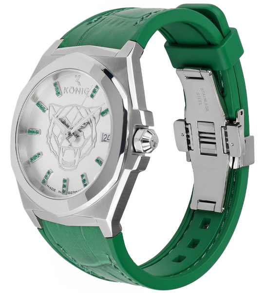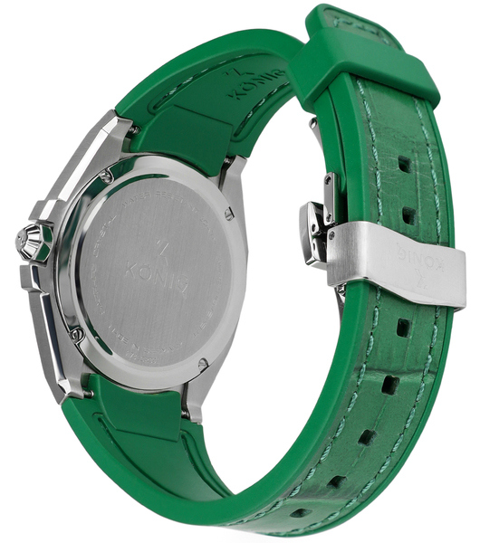 Wykonanie srebrnej koperty ze stali szlachetnej zapewnia czasomierzowi odporność na obrażenia mechaniczne, oraz efekty korodowania. Zegarek wspaniale prezentuje się na zielonym, skórzanym pasku.