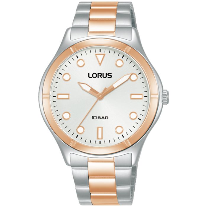 Zegarek damski Lorus FASHION RG246VX9 przyciąga uwagę swoją niecodzienną kolorystyką, składającą się z mieszanki srebra oraz różowego złota. Tym drugim pokryto wewnętrzne ogniwa stalowej bransolety oraz bezel. Srebrną kopertę odlano ze stali szlachetnej 316L zapewniającej wysoką odporność na korozję. Wodoszczelność sprzętu określono na 100m/10Bar, dzięki czemu użytkownik nie musi obawiać się zachlapań, czy nawet płytkich zanurzeń. Urządzenie działa za sprawą wyjątkowo precyzyjnego mechanizmu kwarcowego, zasilanego wytrzymałą baterią. Srebrną tarczę czasomierza zdobią unikalne, złote indeksy pod postacią geometrycznych figur, oraz wskazówki tej samej barwy. Tarczę zamyka wytrzymałe i możliwe do polerowania, mineralne szkiełko.