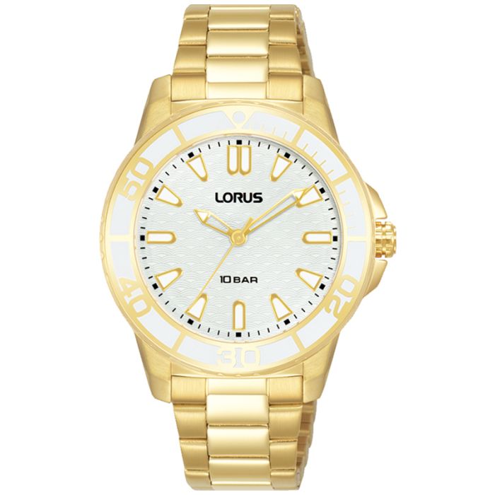 Zegarek damski Lorus SPORT RG256VX9 przyciąga uwagę mieniącym się złotym kolorem. Zarówno kopertę jak i bransoletę wykonano ze stali szlachetnej 316L, a następnie pokryto powłoką PVD aby umożliwić naniesienie koloru żółtego złota. Wodoszczelność sprzętu określono na 100m/10Bar, dzięki czemu użytkownik nie musi obawiać się zachlapań, czy nawet płytkich zanurzeń. Urządzenie działa za sprawą wyjątkowo precyzyjnego mechanizmu kwarcowego, zasilanego wytrzymałą baterią.Na biały bezel nałożono 60-minutową podziałkę typu “diver”. Białą tarczę czasomierza zdobią klasyczne białe indeksy oraz wskazówki tej samej barwy, ozdobione na krawędziach złotą barwą. Tarczę zamyka wytrzymałe i możliwe do polerowania, mineralne szkiełko.