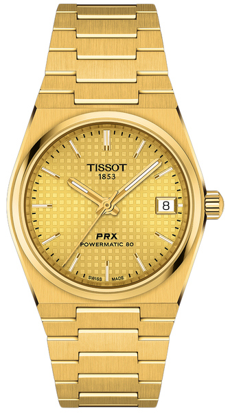 TISSOT T137.207.33.021.00 to zegarek damski o harmonijnym charakterze, który łączy w sobie nostalgiczny blask z nowoczesną pomysłowością. Ten wyjątkowy model o średnicy 35 mm prezentuje się elegancko dzięki wysokiej jakości kopercie pokrytej złotą powłoką PVD, oraz efektownej tarczy w kolorze złotym. Wyjątkowy wzór tarczy gofrowanej podkreśla jego unikalność. Osiągnięcie wodoszczelności do 100 metrów oraz wykorzystanie sprężyny Nivachron™ sprawia, że TISSOT T137.207.33.021.00 to zegarek dla miłośników sztuki zegarmistrzowskiej. Satynowo wykończona stalowa bransoleta z zapięciem motylkowym zapewnia niezrównany komfort użytkowania.