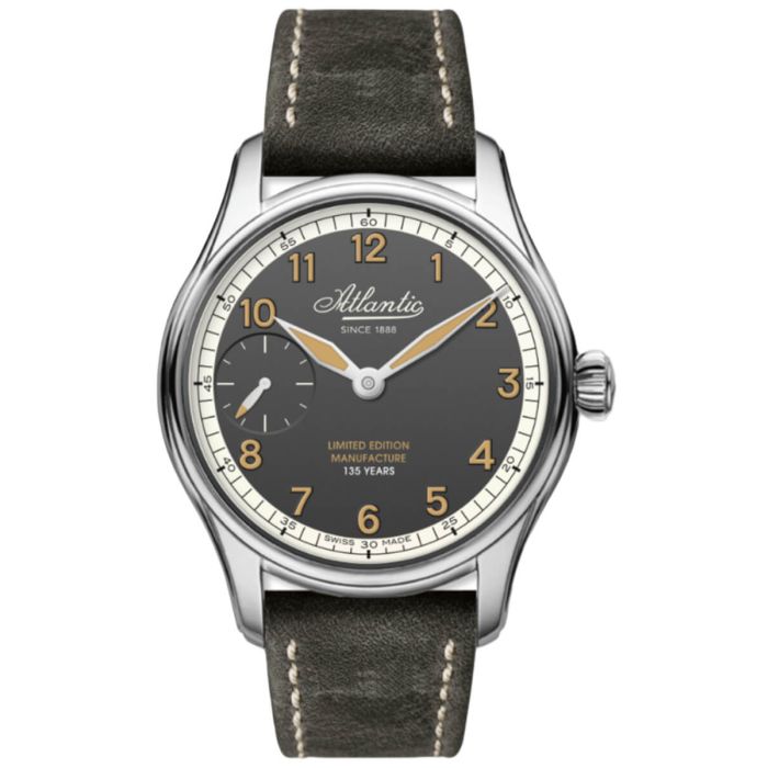 Obecność totalizatora w miejscu indeksu godziny 9 podyktowana została dążeniem do maksymalizacji przejrzystości. Umieszczona na nim wskazówka sekundowa została utrzymana w tej samej kolorystyce co poprzedniczki. Część elementów cyferblatu pokryto warstwą powłoki luminescencyjnej, która umożliwi Ci odczyt godziny nawet w warunkach braku oświetlenia. Na powierzchni tarczy umieszczono logo marki Atlantic, wraz z informacją o limitowanej serii oraz manufakturowym mechanizmie.