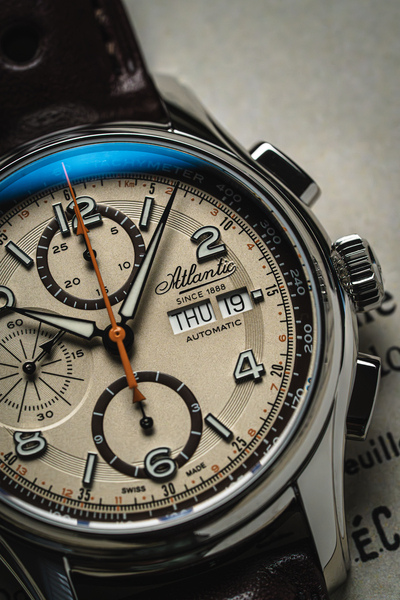 Beżowa tarcza z brązowym okręgiem tachymetru i pomarańczowymi akcentami to hołd dla kultowych zegarków z lat 60. Mistrzowsko wykonane wskazówki stopera oraz świecące dzięki masie luminescencyjnej indeksy gwarantują łatwy odczyt czasu w każdych warunkach. Na godzinie 3 zamieszczono okno datownika Day-Date, dzięki któremu w dowolnej chwili możesz sprawdzić bieżącą datę.