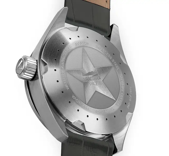 Na boku urządzenia widnieje charakterystyczna dla zegarków lotniczych masywna, zakręcana koronka sygnowana logotypem marki Aviator. Od spodu zegarek zamyka zakręcany dekiel, ozdobiony gwiazdą wewnątrz której widnieje sylwetka samolotu Airacobra P42 - jest to hołd dla pilotów pilotujących te maszyny w czasie wojny. Wspomaganą koronką i deklem wodoszczelność zegarka producent określa na 10 bar, co w sensie praktycznym umożliwi Ci swobodne zachlapywanie, a nawet pływanie, z “Aviatorem” na nadgarstku.
