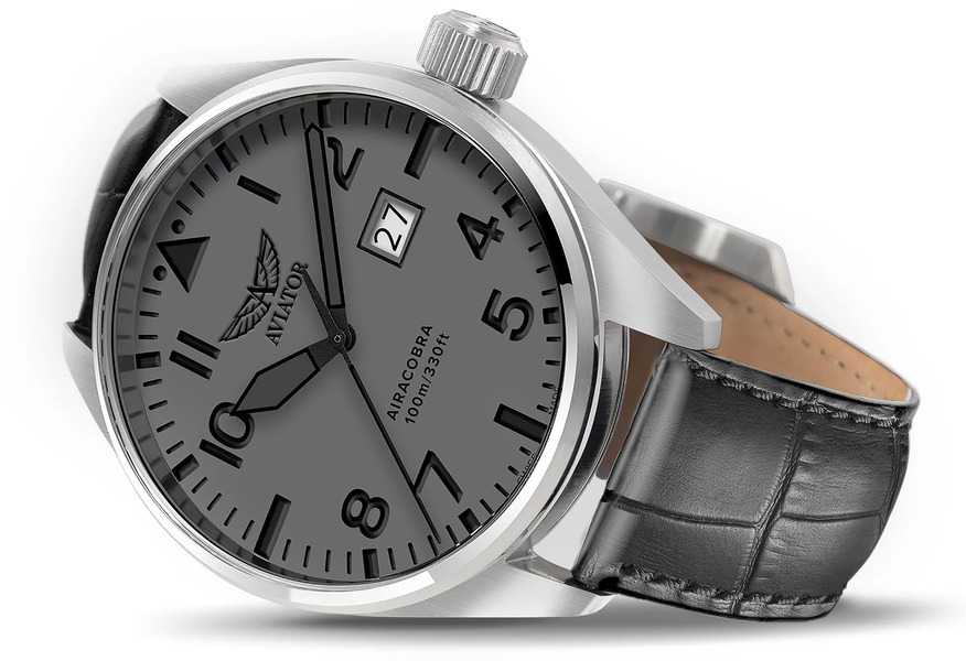 Całość koperty zegarka Aviator Airacobra P42 V.1.22.0.150.4 zaprezentowano konsumentom na eleganckim, czarnym pasku z naturalnej skóry cielęcej. Cechą wyróżniającą go innych czasomierzy jest opływowy, aerodynamiczny kształt, co podkreśla lotniczy styl zegarka.