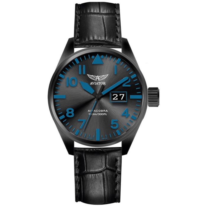Producenci męskiego zegarka Aviator Airacobra P42 V.1.22.5.188.4 przy projekcie koperty zdecydowali się na klasyczny kształt zegarków vintage z lat 40, oraz na elegancką czerń. Przy jej odlewie wykorzystano nierdzewną stal szlachetną 316L, oferującą wyjątkowy poziom odporności na uszkodzenia mechaniczne i gromadzenie się korozji.