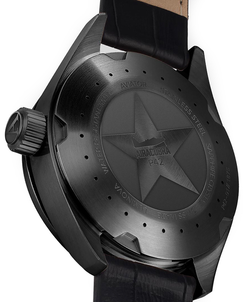 Na boku urządzenia widnieje charakterystyczna dla zegarków lotniczych masywna, zakręcana koronka sygnowana logotypem marki Aviator. Od spodu zegarek zamyka zakręcany dekiel, ozdobiony gwiazdą wewnątrz której widnieje sylwetka samolotu Airacobra P42 - jest to hołd dla pilotów pilotujących te maszyny w czasie wojny. Wspomaganą koronką i deklem wodoszczelność zegarka producent określa na 10 bar, co w sensie praktycznym umożliwi Ci swobodne zachlapywanie, a nawet pływanie, z “Aviatorem” na nadgarstku.