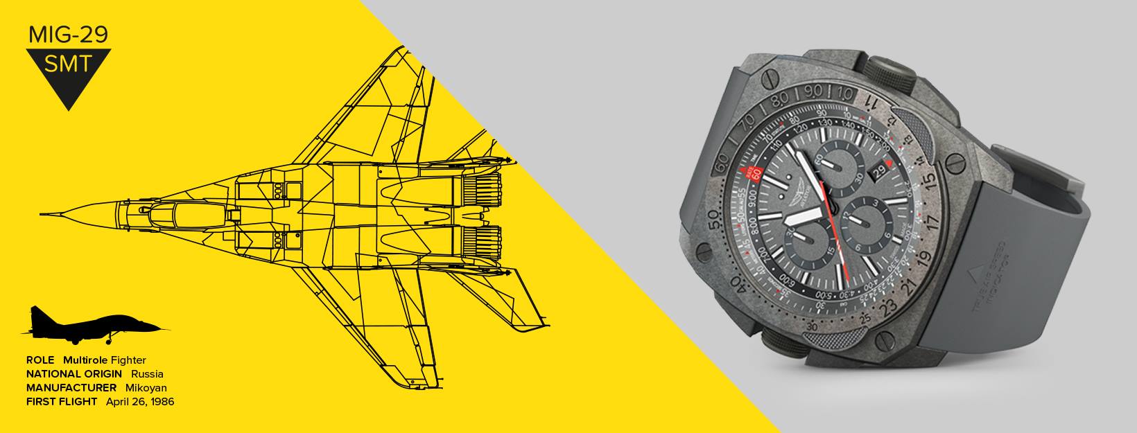 Hołdując legendarnemu już rosyjskiemu myśliwcowi MIG-29 z lat 70-tych, marka Aviator stworzyła kolekcje 5 modeli luźno wzorowanych na kształtach tej właśnie maszyny. Zegarek ten jest nie tylko na pokaz - szereg jego funkcji zapewnia mu miejsce na nadgarstkach pilotów wielu dzisiejszych maszyn. Dla dopełnienia wizerunku, marka Aviator oferuje personalizowaną kurtkę typu Flyers jako gratisowy dodatek do zakupów z tejże kolekcji.