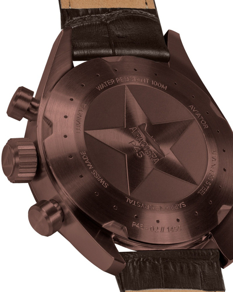 Zdecydowanym wyróżnikiem brązowej koperty męskiego zegarka lotniczego Aviator Airacobra P45 Chrono V.2.25.8.172.4 są unikalne, zakrzywione do dołu uszy i masywna, zakręcana koronka, charakterystyczna dla zegarków lotniczych ze względu na potrzebę możliwości operowania nią w grubych rękawicach pilota. Gustowna barwa została uzyskana za sprawą powłoki PVD, którą pokryto kopertę. Materiał użyty przy odlewie koperty to stal szlachetna 316L znana z odporności na korozję i uszkodzenia mechaniczne.