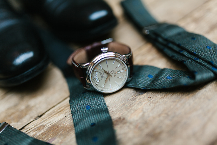 Całość koperty zegarka zaprezentowano na eleganckim, brązowym pasku z naturalnej skóry cielęcej. Cechą wyróżniającą go innych czasomierzy jest opływowy, aerodynamiczny kształt, który podkreśla lotniczy styl zegarka.