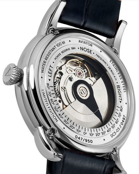 Srebrna koperta zegarka Aviator Douglas V.3.32.0.240.4 została dokładnie wypolerowana na lustro. Materiał jej wykonania to stal szlachetna 316L. Pod tą nazwą kryje się metal odporny na korozję czy też uszkodzenia mechaniczne. Dzięki strategicznie umieszczonym zagięciom, krzywiznę koperty stworzono w sposób zbliżony do projektu samolotu Douglas DC-3.
