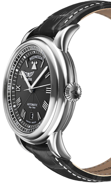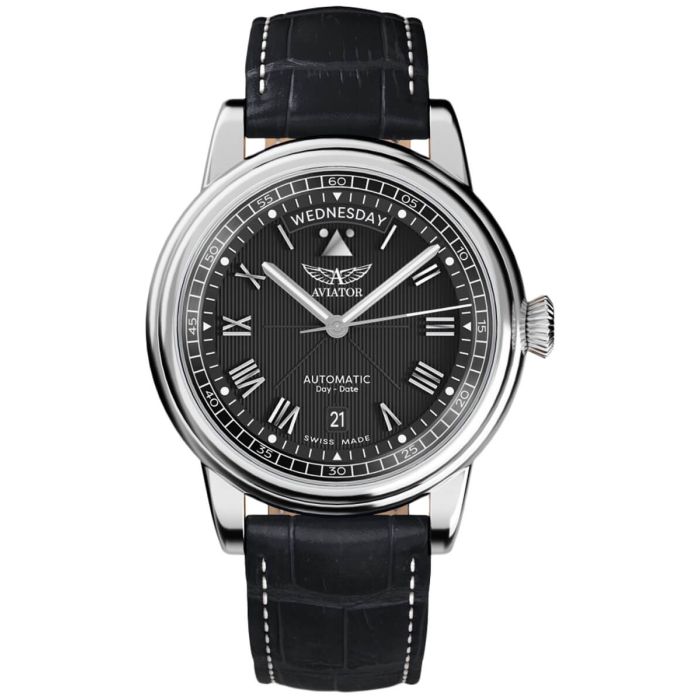 Gustowna czerń pokrywająca powierzchnię tarczy męskiego zegarka lotniczego Aviator Douglas Day-Date V.3.35.0.274.4 tworzy przyjazny oku kontrast ze srebrem wskazówek i indeksów pod postacią cyfr rzymskich, które to dodatkowo pokryto świecącą w ciemności powłoką luminescencyjną SuperLuminova.