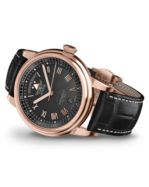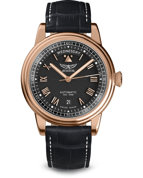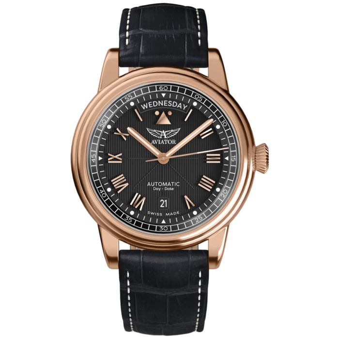 Gustowna czerń pokrywający powierzchnię tarczy męskiego zegarka lotniczego Aviator Douglas Day-Date V.3.35.2.275.4 tworzy przyjazny oku kontrast z różowym złotem wskazówek i indeksów pod postacią cyfr rzymskich, które to dodatkowo pokryto świecącą w ciemności powłoką luminescencyjną SuperLuminova.