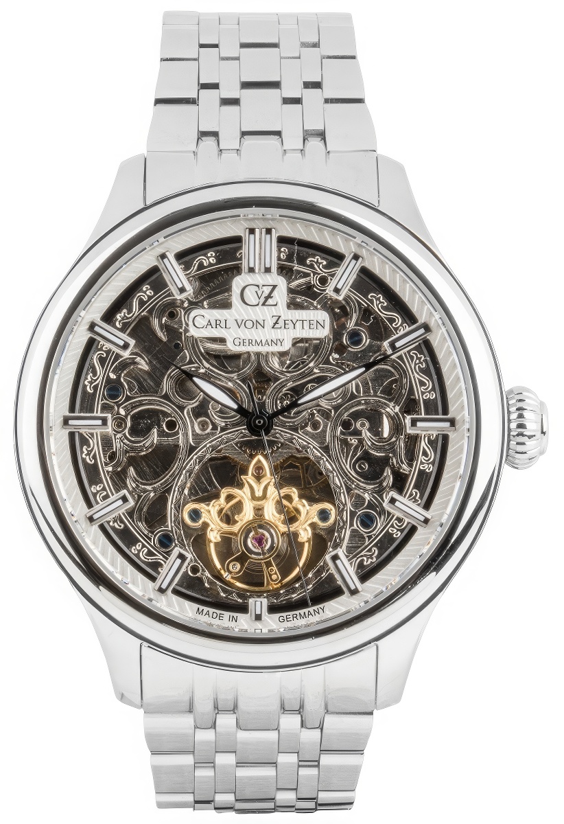 Carl von Zeyten CVZ0014WHMS St. Georgen to zegarek męski, który łączy elegancję i klasyczny styl z nowoczesną technologią. Ten model, wyposażony w mechanizm automatyczny, cechuje się wyjątkowym wyglądem dzięki srebrnej kopercie i bransolecie ze stali szlachetnej oraz transparentnej tarczy typu skeleton. Idealny dla mężczyzn, którzy cenią sobie zarówno funkcjonalność, jak i estetykę.