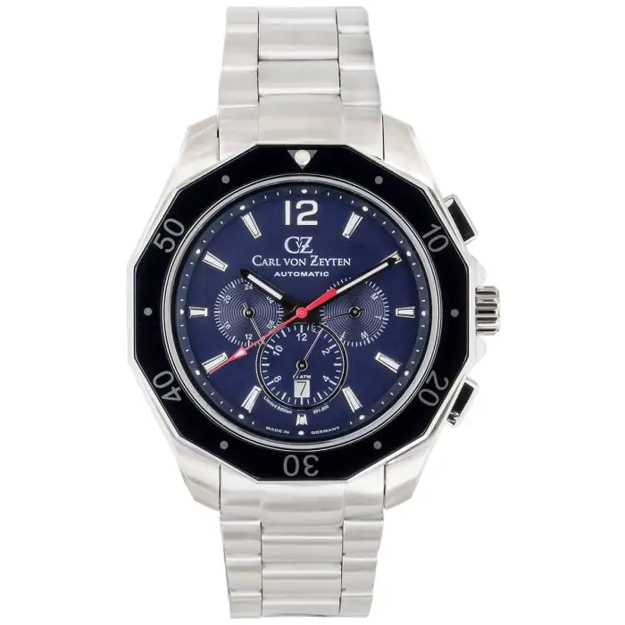 Męski zegarek automatyczny Carl von Zeyten Hausach CVZ0079BLMS to ponadczasowy czasomierz. Ten zegarek męski to edycja limitowana - powstało do 500 sztuk tego modelu. Koperta oraz bransoleta w srebrnym kolorze zostały wykonane ze stali szlachetnej 316L - odpornej na korozję, łatwej w utrzymaniu oraz hipoalergicznej.