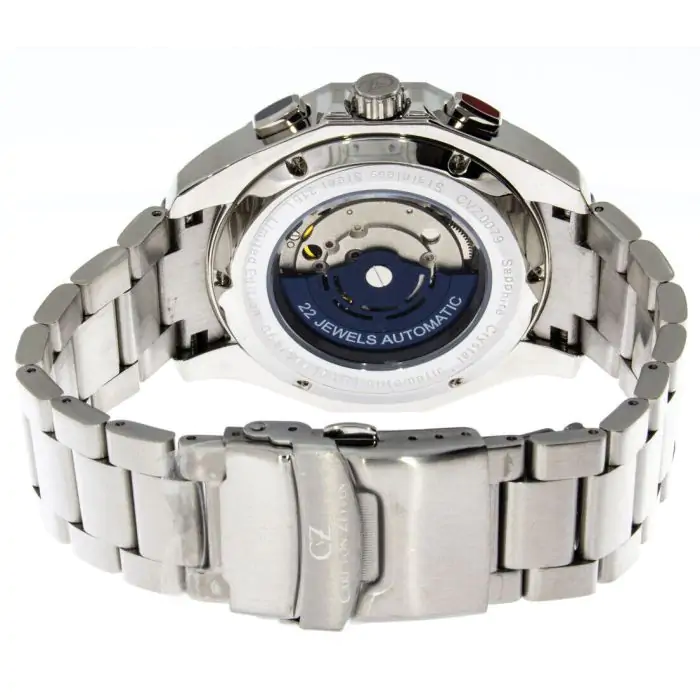 Na granatowej tarczy znajdują się trzy sub-tarcze wskazujące dzień tygodnia, miesiąc oraz czas 24h. Srebrne indeksy wyglądają elegancko na granatowym tle. Wskazówki zostały pokryte powłoką luminescencyjną, która ułatwi Ci odczytywanie godziny nawet w nocy. Całość przykryta jest szkłem szafirowym - twardym i odpornym na zarysowania. Serce zegarka to precyzyjny mechanizm CVZ 613 osadzony na 22 kamieniach. Dzięki niemu nie będziesz potrzebować baterii - siłą napędową zegarka jest ruch nadgarstka.