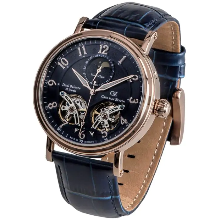 Zegarek męski Carl von Zeyten Murg Twin Balance Automatic przyciąga uwagę kopertą w kolorze różowego złota, pięknie komponującego się z granatową, grawerowaną tarczą zegarka oraz niebieskim skórzanym paskiem. Urządzenie wyróżnia mechanizm automatyczny kaliber 225, przy zastosowaniu systemu dwóch balansów oraz 45 kamieni łożyskowych. Zapewnia przez to jeszcze większą dokładność oraz stabilność. Ładowany jest podczas ruchu nadgarstka. Tarcza zegarka zawiera dwa otwory typu Open-Heart. Umożliwiają one obserwację pracy obydwu balansów. Nad otworami znalazł się również wskaźnik faz księżyca oraz datownik. Wszystko zostało przysłonięte nierysującym się szafirowym szkiełkiem. Na odwrocie zegarka ujrzymy transparentny, możliwy do zdjęcia dekiel.Całość chroni szkiełko szafirowe.