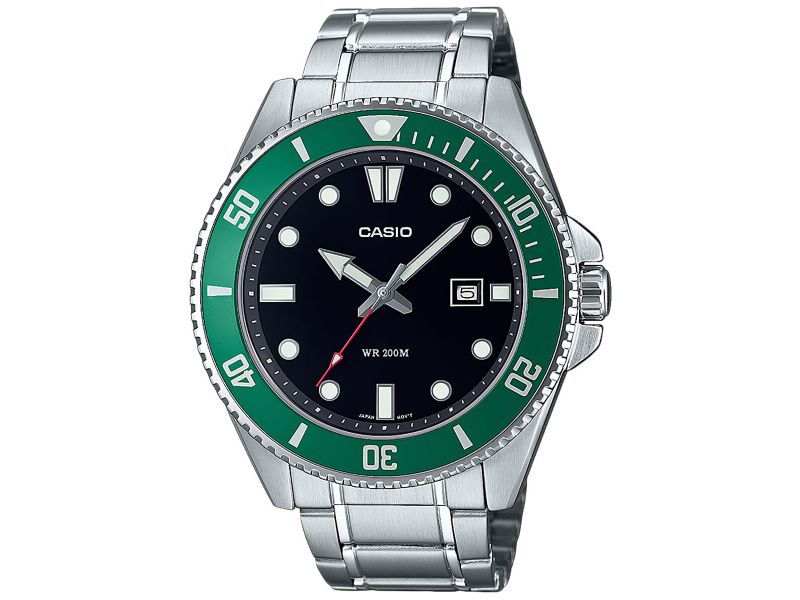 Bezel okalający tarczę w tym zegarku typu diver od Casio obraca się w jedną stronę, co pozwlaa na szybki odczyt czasu nurkowania.