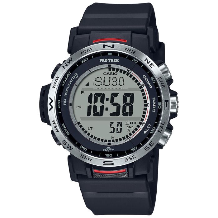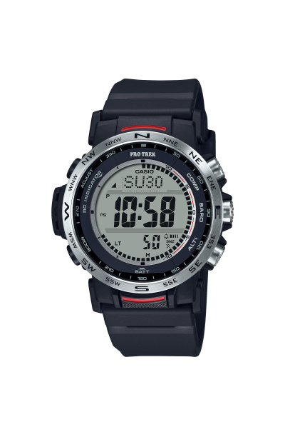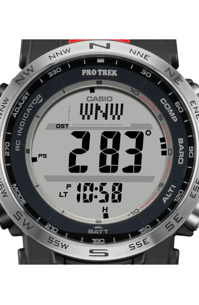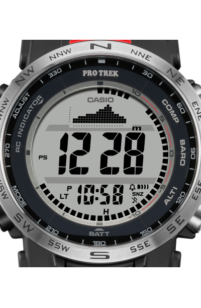 ProTrek PRW-35-1AER posiada wyświetlacz cyfrowy, który umożliwia łatwy odczyt czasu. Dzięki diodzie elektroluminescencyjnej, tarcza zegarka automatycznie podświetla się po obróceniu go w stronę twarzy, zapewniając doskonałą widoczność nawet w ciemności. Tarcza jest chroniona przez wytrzymałe szkło mineralne, które skutecznie chroni przed zarysowaniami. ProTrek PRW-35-1AER oferuje wiele zaawansowanych funkcji, które są niezwykle przydatne podczas aktywności outdoorowych. Zegarek posiada tryb czasu światowego, umożliwiający łatwą kontrolę różnych stref czasowych. Funkcja oszczędzania energii pozwala przedłużyć działanie zegarka, a tryb mute dezaktywuje dźwięki powiadomień. Dodatkowo, zegarek wyposażony jest w barometr, kompas, termometr oraz wskaźnik wschodu i zachodu słońca, co umożliwia monitorowanie warunków atmosferycznych, orientację w terenie oraz planowanie aktywności na świeżym powietrzu. Zegarek posiada również funkcję alarmu z możliwością ustawienia aż pięciu alarmów dziennych, rozbudowany kalendarz oraz stoper i timer, które są przydatne podczas treningu i planowania czasu. Wysokościomierz pozwala na odczytywanie wysokości aż do 10000 m n.p.m. Dodatkowo, zegarek wykorzystuje technologię Waveceptor, umożliwiającą synchronizację radiową i precyzyjne wyświetlanie czasu.
