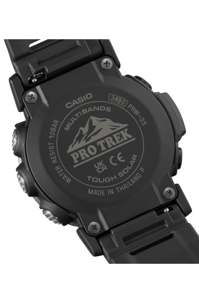 ProTrek PRW-35-1AER ma czarną kopertę o kształcie okrągłym, wykonaną z trwałego tworzywa sztucznego. Koperta jest uszczelniona, co gwarantuje wodoszczelność do 10 ATM, umożliwiając korzystanie z zegarka podczas pływania czy w trudnych warunkach atmosferycznych. Zegarek jest wyposażony w czarny pasek z tworzywa sztucznego, który zapinany jest na sprzączkę. Maksymalny obwód zegarka (koperta + pasek) wynosi 21.0 cm, co pozwala na dopasowanie do różnych rozmiarów nadgarstka.