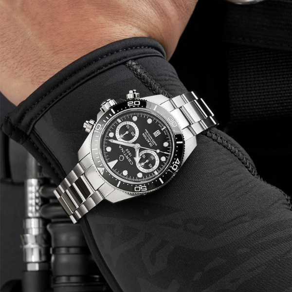 Koperta zegarka wykonana jest z wysokogatunkowej stali nierdzewnej, co zapewnia jej trwałość i odporność na uszkodzenia. Srebrny kolor koperty o klasycznej szerokości 45 mm i grubości 16 mm nadaje zegarkowi elegancki wygląd, który doskonale łączy się z nowoczesnym, sportowym charakterem. Zakręcany dekiel i koronka gwarantują maksymalną szczelność, chroniąc mechanizm przed wnikaniem wody. Obrotowy pierścień antyrewersyjny pełni funkcję minutnika, co jest niezwykle przydatne podczas nurkowania, umożliwiając precyzyjny pomiar czasu spędzonego pod wodą.Zegarek posiada stalową bransoletę, która nie tylko elegancko się prezentuje, ale również jest wygodna w użytkowaniu. Wyposażona w zatrzaskowe zapięcie z zabezpieczeniem, gwarantuje pewne mocowanie zegarka na nadgarstku, a jednocześnie umożliwia szybkie i łatwe zakładanie oraz zdejmowanie.