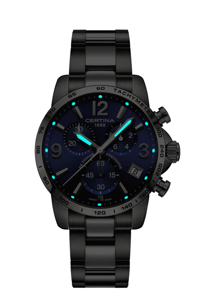 Zegarek Certina C034.417.11.047.00 wyróżnia się niebieską tarczą, na której znajdują się trzy subtarcze chronografu oraz datownik dni miesiąca, co pozwala na precyzyjne śledzenie czasu i daty. Tachymetr umieszczony na zewnętrznej krawędzi tarczy dodatkowo rozszerza funkcjonalność zegarka, umożliwiając pomiar prędkości. Wskazówki zegarka pokryte są powłoką Super-LumiNova, co zapewnia doskonałą czytelność nawet w słabych warunkach oświetleniowych. Całość chroniona jest przez szafirowe szkło z powłoką antyrefleksyjną, które gwarantuje wyjątkową odporność na zarysowania i optymalną widoczność w każdych warunkach.