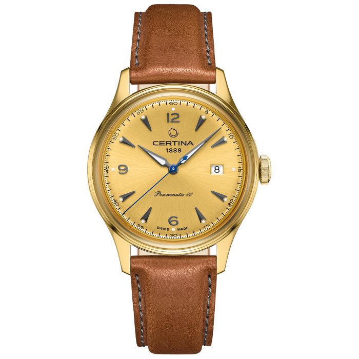 Złota tarcza zegarka Certina C038.407.36.367.00 zachwyca eleganckim wykończeniem, harmonizując z delikatnymi wskazówkami i indeksami. Klasyczne, analogowe wskazanie czasu podkreślają luminescencyjne akcenty Super-LumiNova, które gwarantują doskonałą widoczność nawet w słabych warunkach oświetleniowych. Tarcza jest chroniona przez wyjątkowo odporne na zarysowania szkło szafirowe z powłoką antyrefleksyjną, co zapewnia czytelność wskazań niezależnie od kąta padania światła. Funkcja datownika wskazuje dzień miesiąca, co dodatkowo podkreśla praktyczny charakter zegarka.