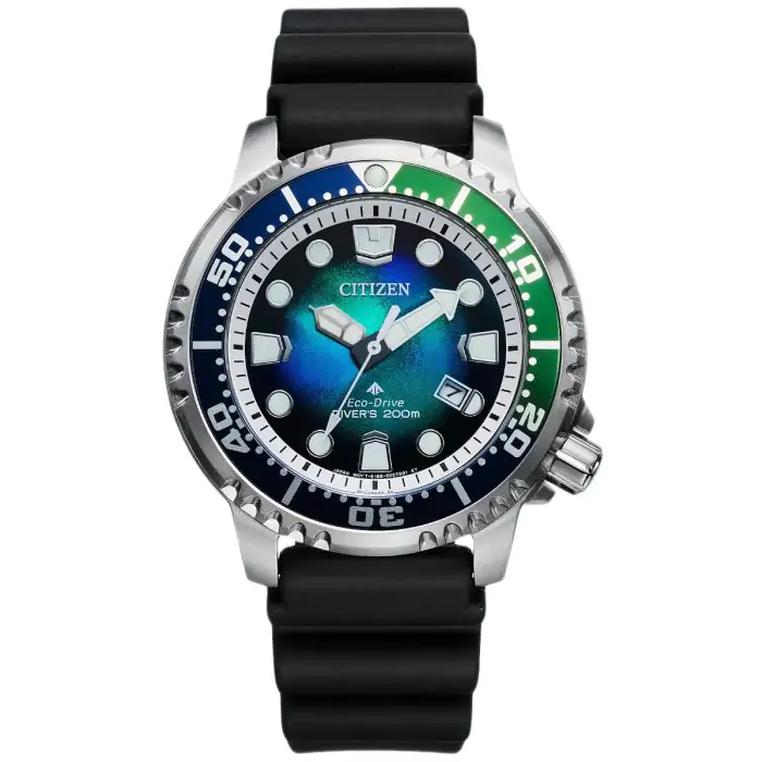 Tarcza tego zegarka męskiego jest wielobarwna, z przewagą koloru niebieskiego. Przełamuje go zielona wstawka, znajdująca się po prawej stronie. Na tarczy umieszczono duże białe indeksy, dzięki czemu odczytasz godzinę bez problemu nawet w ciemności morskich głębin. Całości dopełniają stylizowane wskazówki. Na godzinie czwartej został umieszczony datownik informujący o aktualnym dniu miesiąca.
