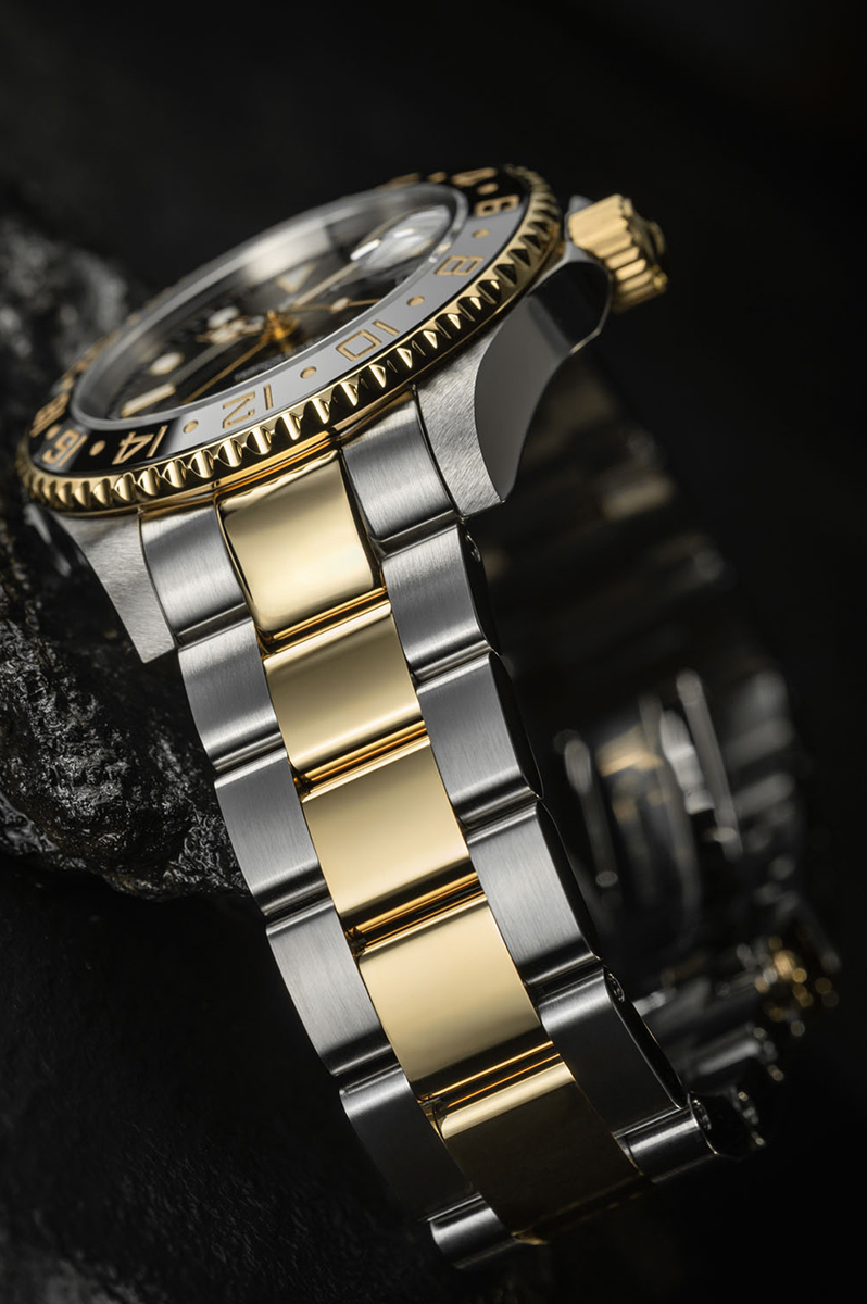 Czarna tarcza zegarka wyróżnia się najwyższą jasnością dzięki zastosowaniu materiału luminescencyjnego SuperLumiNova® BGW9, który w świetle naturalnym jest biały, a w ciemności świeci jasnoniebieskim kolorem, zapewniając doskonałą czytelność w każdych warunkach. Kolorowa wskazówka GMT informuje o czasie w drugiej strefie, co jest szczególnie przydatne, gdy chcemy wiedzieć, czy nasz rozmówca z innego kontynentu jest dostępny, lub kiedy najlepiej jest kontaktować się z rodziną podczas podróży.