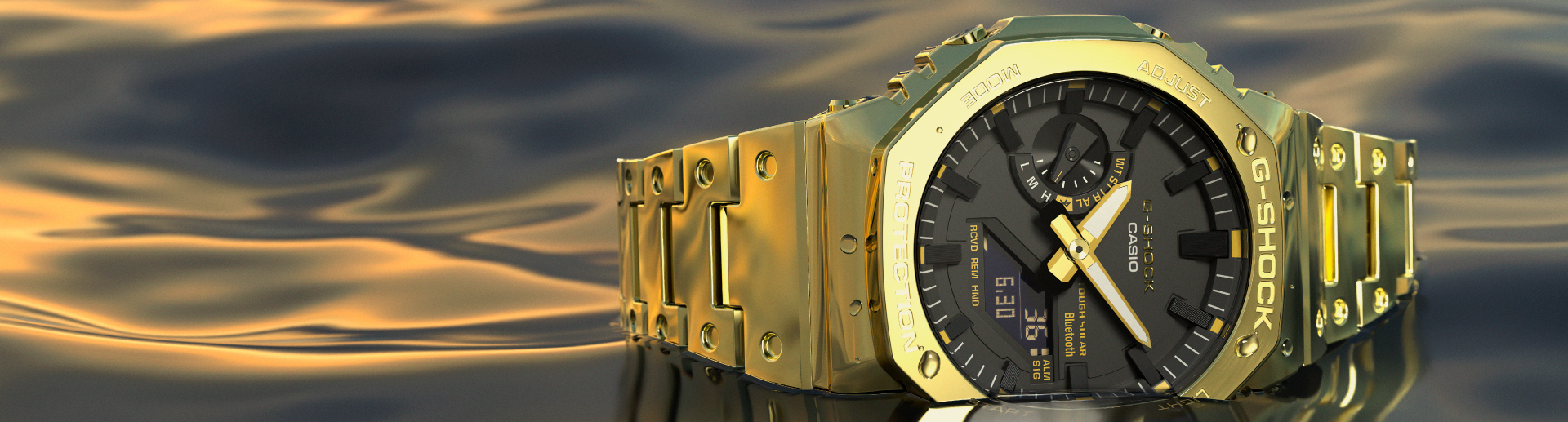 Zegarek ten przyciąga spojrzenie kolorem żółtego złota. Powłoka w tym kolorze została ukazana nie tylko na bransolecie i kopercie, lecz również w detalach czasomierza — koronkach, przyciskach bocznych oraz wskazówkach. Szczotkowane wykończenie górnej powierzchni koperty w połączeniu z elementami wykończonymi wysokim połyskiem idealnie podkreśla szlachetną, złotą barwę zegarka. To wszystko sprawia, że zegarek GM-B2100GD ma niezwykle luksusowy wygląd.