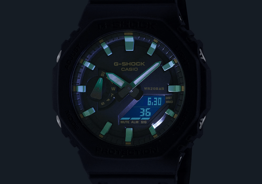 Czarny cyferblat G-Shocka stanowi uniwersalne tło pod multum funkcjonalnych wskaźników. Sam układ tarczy opiera się o analogowo-cyfrowe wskazanie czasu. Właśnie z tego wynika obecność zarówno morsko-zielonych indeksów, oraz zestawu biało-zielonych wskazówek. Dodatkowe pokrycie elementów cyferblatu warstwą luminescencyjnej powłoki Neobrite pozwala im na pochłanianie światła dziennego, a następnie oddawanie go w warunkach braku światła. Zawarty datownik w dowolnym momencie wskaże ci bieżący dzień tygodnia. Z cyfrowego wyświetlacza bez problemu odczytasz godzinę, w formacie 12 i 24-godzinnym.