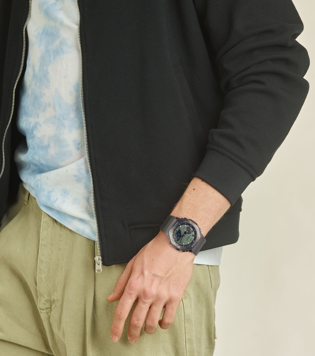 Tarcza zegarka jest w czarnym, uniwersalnym kolorze. Zegarek G-SHOCK GM-2100B-3AER posiada zarówno wyświetlacz analogowy, jak i cyfrowy. Powłoka Neobrite ułatwi Ci wygodne odczytywanie godziny nawet w nocy, zaś wbudowana dioda umożliwia podświetlenie cyferblatu wtedy, gdy tego potrzebujesz. Tarcza tego zegarka sportowego G-SHOCK pokryta jest szkłem mineralnym odpornym na stłuczenia. Klasyczna, czarna koperta zegarka GM-2100B-3AER w kształcie heksagonu wykonana jest z połączenia stali i włókna węglowego. Dzięki temu jest bardzo lekka, wygodna i wytrzymała. Gwarantujemy Ci wygodę podczas długiego noszenia, jak i odpornośc na zarysowania. Minimalistyczny, czarny pasek świetnie skomponuje się z barwą koperty i tarczy, tworząc spójną, męską kompozycję. Materiałowy pasek o tradycyjnym zapięciu doskonale dopasuje się do nadgarstka.