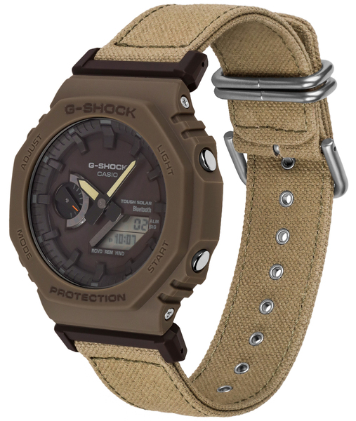 Tym razem marka G-Shock poszła o krok dalej z zaangażowaniem w ochronę natury za sprawą dwóch innowacji: TRUECOTTON oraz FOOD TEXTILE. W celu promowania etycznego pozyskiwania materiałów, tkanina, z której wykonano pasek to organiczna bawełna TRUECOTTON. Pochodzenie tego materiału można śledzić, by dowiedzieć się, z jakiej farmy i przędzalni ta pochodzi. Dzięki temu marka G-Shock dba zarówno o środowisko, jak i również wspiera rzemieślników, stawiając na wysoką jakość produkcji. Kolor paska uzyskany został za sprawą naturalnych barwników FOOD TEXTILE. Do barwienia paska tego zegarka męskiego G-Shock GA-B2100, zostały wykorzystane naturalne barwniki wyprodukowane z żywności, która w innym przypadku zostałaby zmarnowana. Delikatna, ziemista barwa paska upiększająca ten zegarek męski powstała za sprawą barwnika pozyskiwanego z jeżówki. Dzięki takiemu zabiegowi materiały, które miały trafić na śmietnik, otrzymały nowe życie w pięknej formie — zegarka przyjaznemu środowisku.