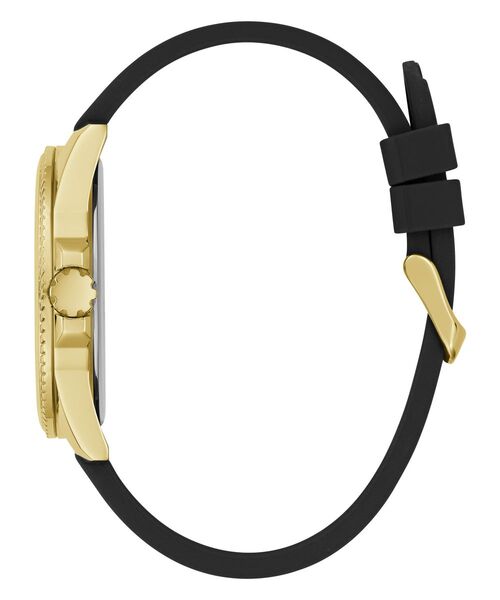 GUESS GW0639G2 to zegarek męski z czarną tarczą. Prosta i gładka struktura tarczy dodaje męskości i wyjątkowości temu zegarkowi Guess. W połączeniu ze złotymi indeksami oraz wskazówkami tarcza wygląda dostojnie, klasycznie oraz elegancko. Ponadto, wskazówki pokryte są powłoką luminescencyjną, co ułatwia odczytanie godzinę również w nocy za sprawą tego złotego męskiego zegarka Guess.