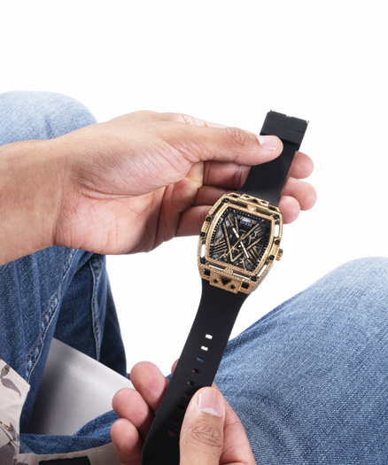 Guess Legend GW0564G1 zachwyca ilością swoich zdobień i, przy pomocy powierzchni tarczy składającej się z prostych linii, zapewnia efekt trójwymiarowości. Złote wskazówki odpowiadają kolorystycznie reszcie koperty, pokrytej powłoką IP i wypełnioną cyrkoniami.