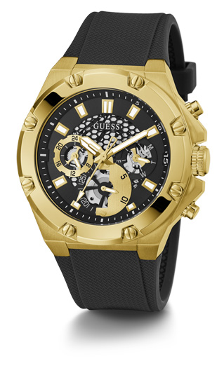 Stalową kopertę męskiego zegarka Guess Third Gear GW0334G2 wykonano ze stali szlachetnej 316L - stopu metali charakteryzującego się odpornością na uszkodzenia mechaniczne oraz wpływy korozji. Zabarwienie jej na złoty kolor podnosi poziom prestiżu zegarka, a poprzez to również użytkownika. Równie złoty bezel ozdabiają odkryte śruby mocujące. Na boku widnieje delikatnie profilowana koronka. Wodoszczelność zegarka wynosi 30m. Całość widnieje na czarnym, silikonowym pasku.