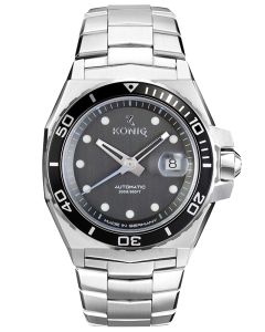 Czasomierz jest pełnoprawnym diverem, oferując wodoszczelność na poziomie 200m, co umożliwia pływanie z zegarkiem, a nawet nurkowanie na niewielkich głębokościach. Wszystko to zasługa solidnej, srebrnej koperty ze stali szlachetnej odpornej na uszkodzenia mechaniczne oraz korozję. Dodatkowo, na boku obudowy znajduje się zakręcana koronka, pomagająca w uszczelnieniu urządzenia. Tarczę okala czarny, obrotowy bezel, ułatwiający pomiar czasu zanurzenia. Całość zaprezentowano na srebrnej, stalowej bransolecie odpornej na uszkodzenia i efekty korodowania.