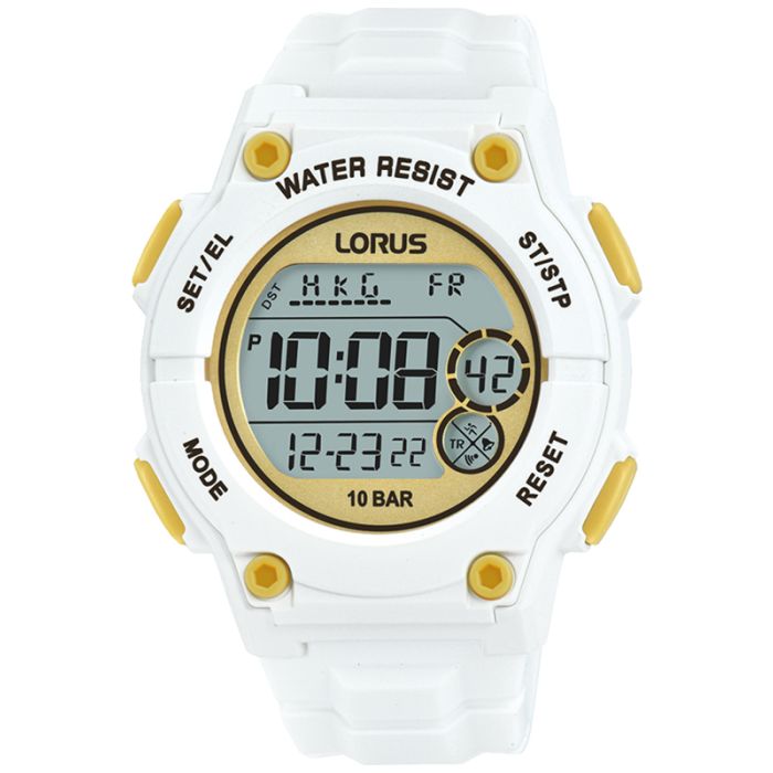 Cyfrowy zegarek męski Lorus R2337PX9 odznacza się swoją wyjątkową funkcjonalnością. Zawieszoną na silikonowym pasku kopertę wykonano z bezpiecznego i przyjemnego dla skóry tworzywa sztucznego. Wszystko utrzymano w gustownym kolorze białym, z elementami w kolorze żółtym. Czasomierz posiada 4 funkcjonalne, opisane na bezelu przyciski, po 2 na bok urządzenia. Wodoszczelność sprzętu określono na 100m/10Bar, dzięki czemu użytkownik nie musi obawiać się zachlapań, czy nawet płytkich zanurzeń. Urządzenie działa za sprawą wyjątkowo precyzyjnego mechanizmu kwarcowego, zasilanego wytrzymałą baterią. Cyfrowa tarcza zegarka, oprócz wskazania godziny, posiada także funkcję kalendarza, stopera (z funkcją timera odmierzającego czas wstecz) czy też alarmu. Możliwa jest także zmiana formatu czasu (12/24 h). Zegarek pokazuje czas lokalny, ma też opcje odczytu z drugiej strefy czasowej. Cyferblat chroniony jest wytrzymałym, akrylowym szkiełkiem.