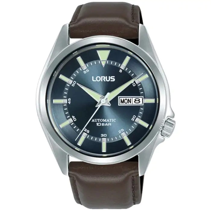 Zegarek męski Lorus AUTOMAT RL427BX9 w fenomenalny sposób łączy wygodę z wytrzymałością. Solidną, srebrną kopertę odlano ze stali szlachetnej odpornej na korozję. Zawieszono ją na eleganckim, brązowym pasku ze skóry naturalnej. Wodoszczelność sprzętu określono na 100m/10Bar, dzięki czemu użytkownik nie musi obawiać się zachlapań, czy nawet płytkich zanurzeń zegarka. Urządzenie działa w oparciu o mechanizm automatyczny łożyskowany na 21 kamieniach, samoczynnie nakręcający się za sprawą ruchów nadgarstka. Zamknięta pod mineralnym, wytrzymałym szkiełkiem tarcza urządzenia w kolorze niebieskim tworzy doskonałą kompozycję z jasnymi wskazówkami i indeksami, ułatwiając odczyt godziny. Dodatkowo zarówno wskazówki jak i indeksy pokryte zostały powłoką luminescencyjną, ułatwiającą korzystanie z zegarka przy braku oświetlenia. Funkcjonalność uzupełnia datownik dni miesiąca i tygodnia.
