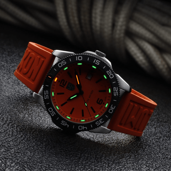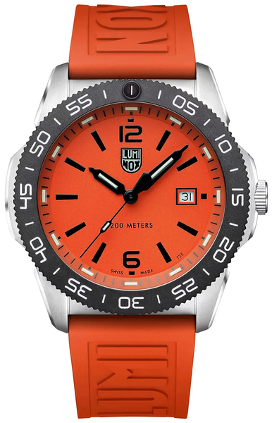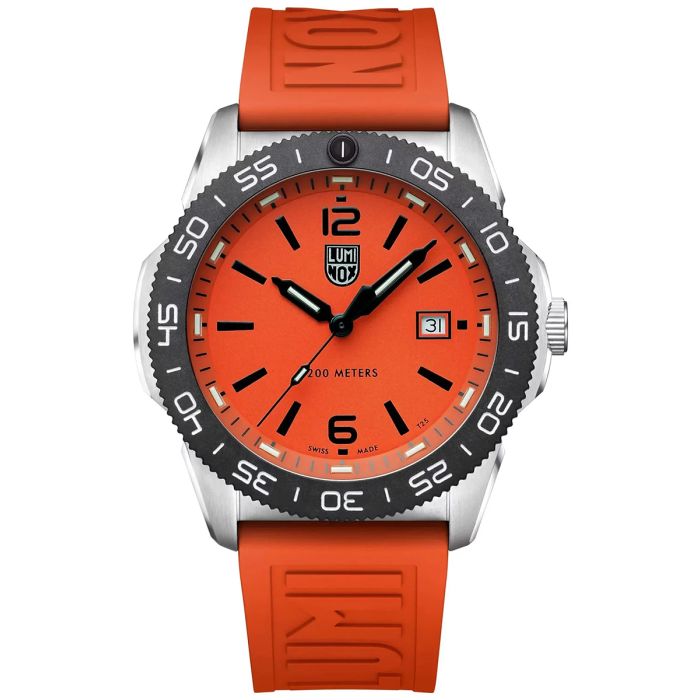 Zegarek męski Luminox Pacific Diver XS.3129 to przyciągający spojrzenia czasomierz sportowy, stworzony z myślą o wykorzystaniu go zarówno przy ekstremalnych aktywnościach outdoorowych, jak i w życiu codziennym. Pomarańczowy cyferblat z czarnymi indeksami i wskazówkami tworzy harmonijną kompozycję, a dopasowany pasek z gumy dodaje letniego stylu.
