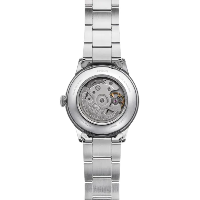 Orient RA-AC0M09E30B napędzany jest japońskim mechanizmem mechanicznym z ręcznym naciągiem, Cal.F6222, który jest synonimem precyzji i niezawodności. Mechanizm ten wyposażony jest w 24 kamienie łożyskujące, które minimalizują tarcie wewnętrznych elementów, co wydłuża jego żywotność. Z rezerwą chodu wynoszącą 40 godzin, zegarek ten może działać bez przerwy nawet po dłuższym czasie bez noszenia. Przez transparentny dekiel można podziwiać misterną pracę mechanizmu, co dodaje zegarkowi unikalnego charakteru i podkreśla jego techniczną doskonałość.