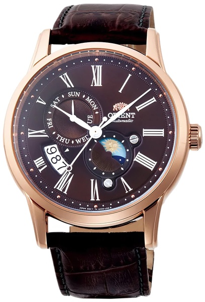 Brązowa tarcza Orient RA-AK0009T10B nadaje temu zegarkowi wyjątkowego charakteru. Klasyczne, analogowe wskazówki i czytelne indeksy sprawiają, że odczytanie aktualnego czasu jest intuicyjne. Dodatkowo, zegarek posiada wskaźnik fazy księżyca, co z pewnością przypadnie do gustu zapalonym wędkarzom oraz miłośnikom natury. Datownik nie tylko informuje o dniu miesiąca, ale również podaje nazwę dnia tygodnia, co jest praktycznym udogodnieniem.