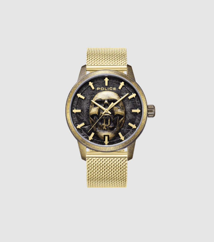 Zegarek Police PEWJG0005504 ma okrągłą tarczę, która jest pokryta szkłem mineralnym o wysokiej odporności na zarysowania. Tarcza ma kolor czarny z błyszczącymi złotymi wskazówkami i indeksami. Na tarczy znajduje się wzór złotej czaszki. Tarcza jest czytelna, a zarazem dynamiczna i oryginalna.