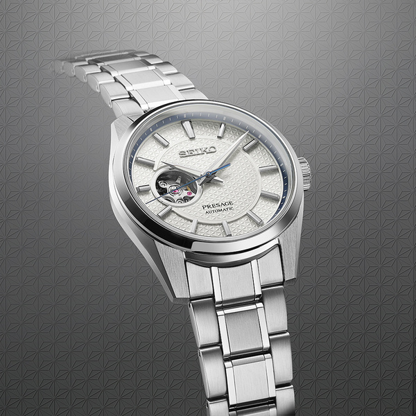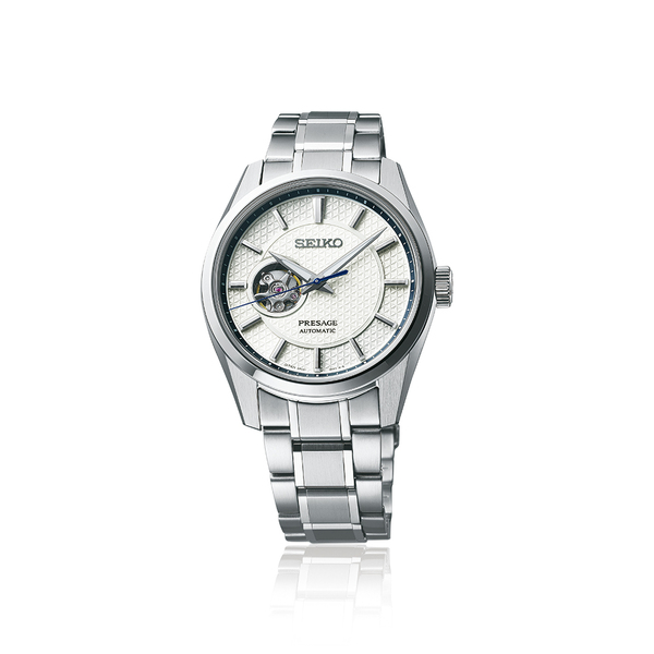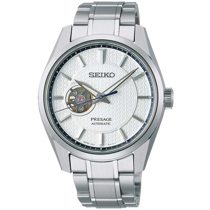 Biel eleganckiej tarczy męskiego zegarka Seiko Presage Sharp Edged SPB309J1 jest podkreślana giloszowanym, trójkątowym wzorem pokrywającym jej powierzchnię. Okalające jej krawędź indeksy oraz podążające za nimi wskazówki (za wyjątkiem niebieskiej wskazówki sekundowej) utrzymano w gustownej barwie srebrnej, dodatkowo pokrywając je warstwą powłoki luminescencyjnej LumiBrite. Umożliwi Ci ona odczyt godziny nawet w warunkach braku światła. Na wysokości godziny 9 widnieje okrągłe okienko przez które możesz obserwować pracę mechanizmu swojego czasomierza.