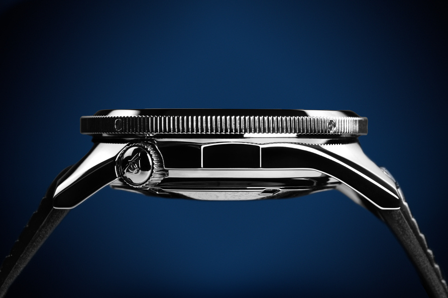 Wierzch zegarka otacza srebrny, gęsto profilowany bezel jednostronnie obrotowy, na który naniesiono pierścień pokryty podziałką tachometru. Za jego sprawą nie doświadczysz trudności przy określaniu czasu spędzonego pod powierzchnią wody..