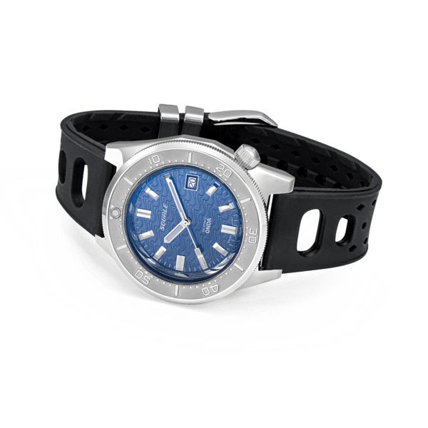 Projektując cyferblat modelu SQUALE 1521ODG.NT, twórcy postawili na barwę niebieską, naturalnie kojarzoną z błękitem wody. Krawędź tarczy okala biała podziałka minutowa, nad której poziomem jawią się wyraźne, jasne indeksy. Srebrzystobiałe i pomarańczowe wskazówki są stosunkowo szerokie, dzięki czemu cyferblat zyskuje dużo na przejrzystości. Zarówno wskazówki, jak i indeksy, pokryto warstwą powłoki luminescencyjnej SuperLuminova C3, dzięki czemu zawartość cyferblatu będzie dla Ciebie widoczna w warunkach nawet największych ciemności. W miejscu indeksu godziny 3 zawarto okienko datownika, wskazujące bieżący dzień miesiąca. Dodatkowo, powierzchnię tarczy ozdabia logo marki Squale, wraz z informacją o kolekcji oraz poziomie wodoszczelności.