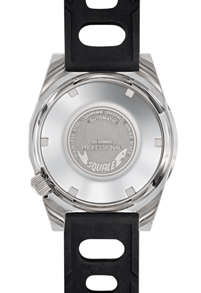 Koperta zegarka Squale umieszczona jest na czarnym, silikonowym pasku. Klamrowe zapięcie paska wykonane jest ze stali szlachetnej 316L, niezwykle odpornej na korozję.