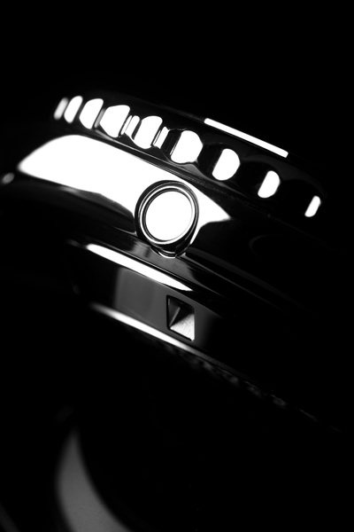 Tarczę zegarka otacza profilowany bezel z czerwono-niebieskim pierścieniem, z pomocą którego możesz na bieżąco kontrolować czas zanurzenia podczas nurkowania. Zastosowanie rozwiązania "Push to release" usprawnia manipulację tachymetrem i zabezpiecza przed przypadkowymi odchyłami w precyzji.
