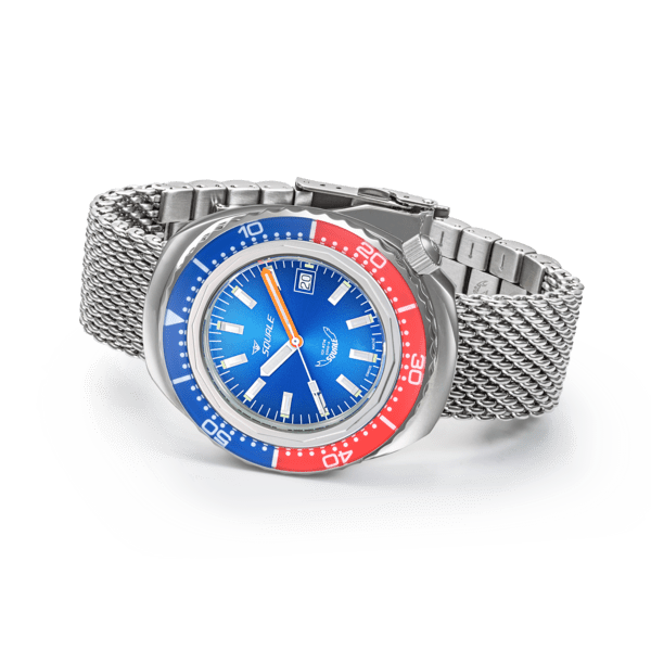 Koperta zegarka Squale umieszczona jest na srebrnej bransolecie meshowej w stylu mediolańskim. Materiał jej wykonania to stal nierdzewna, może się zatem pochwalić wytrzymałością i odpornością na korozję.